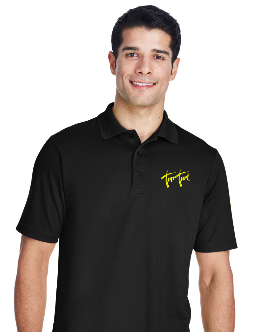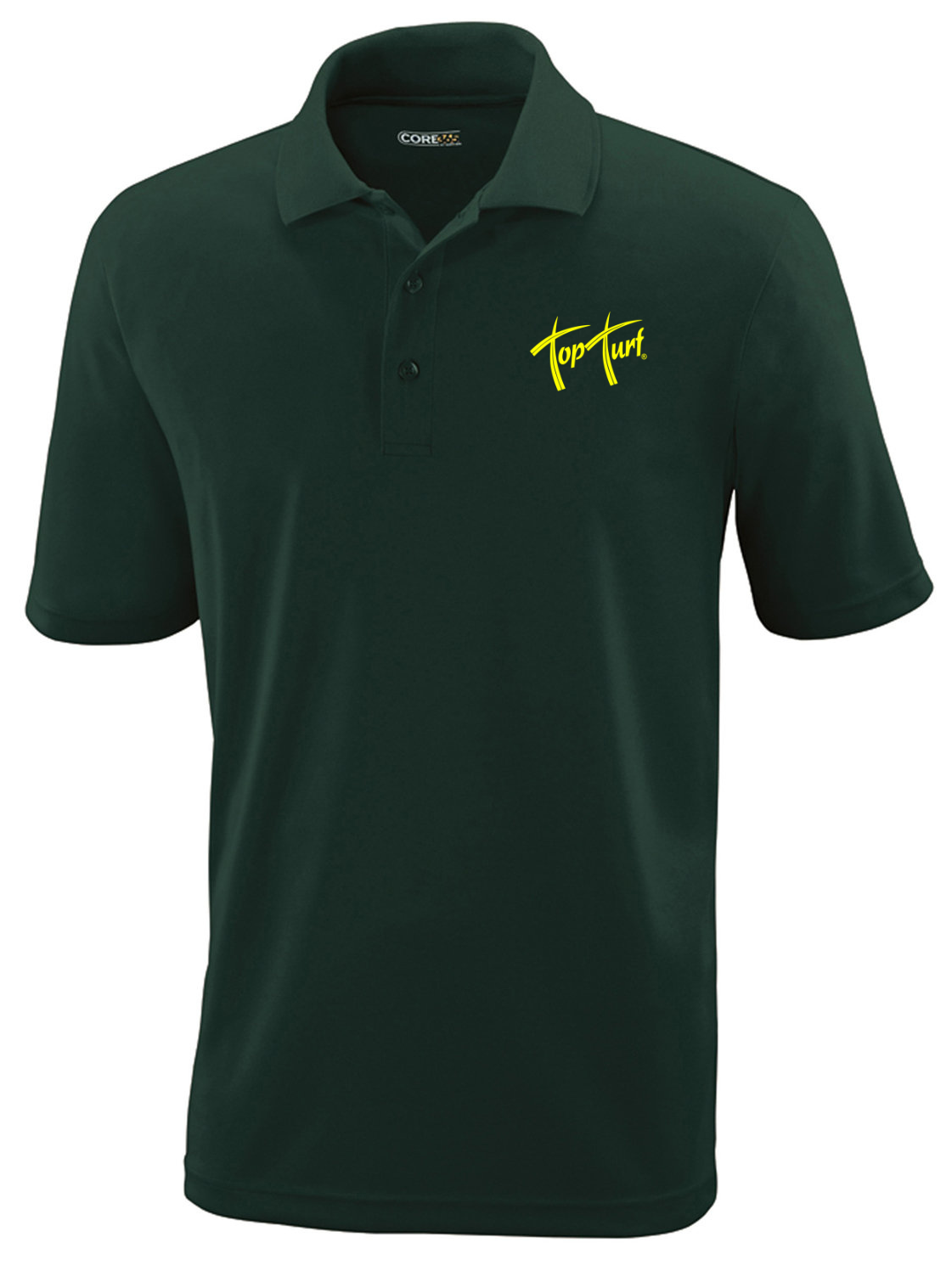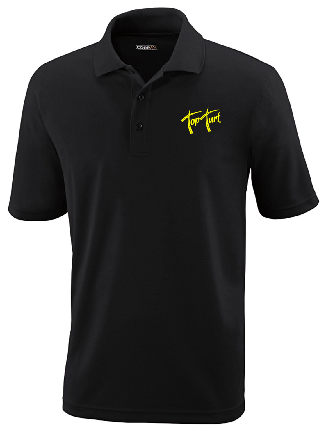 A touch of sophistication is added with its matching flat-knit collar, elevating your look whether you're on the golf course or out for brunch. The heat-seal label ensures irritation-free wear, enhancing your comfort further. The Top Turf logo is embroidered on the left chest of the front of the shirt. Core365. 88181.
